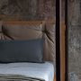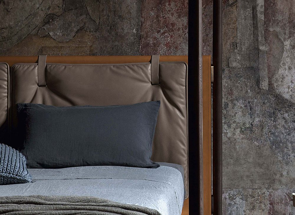 ヘッドボードはブナ材で、内部にカバ積層板とハードボードパネルの充填材が入っています。ポリエステル綿と綿ファブリックを使用したボリューム感のある柔らかなクッションは、2本のレザーベルトでヘッドボードに固定されています。ヘッドボード前面のガンメタルカラー仕上げ金属製アイレットに通されているベルトは、同じくガンメタルカラー仕上げのボタンで裏側から固定されています。ボタンにはPoltrona Frauのロゴが入っています。クッションのカバー材はPelle Frau®またはファブリックで、レザーパイピングで仕上げられています。