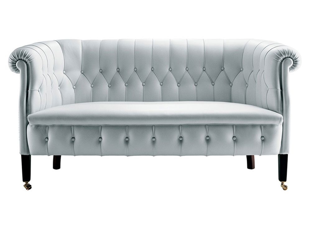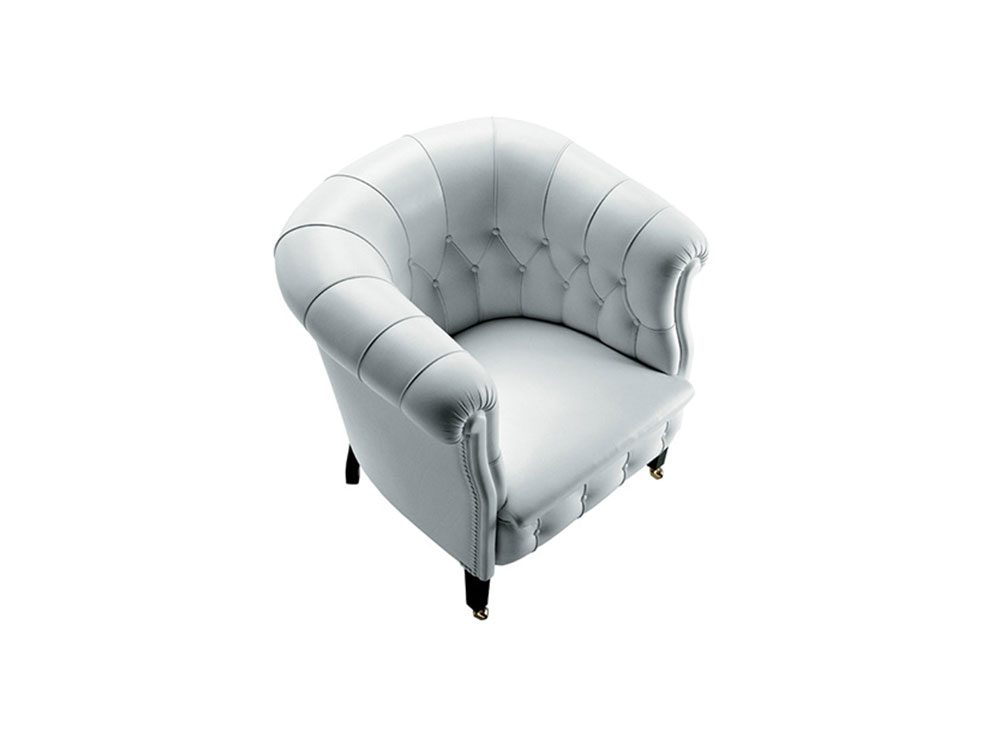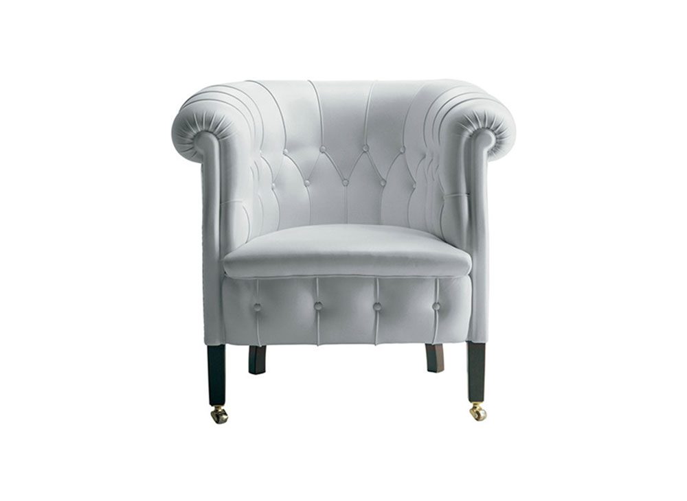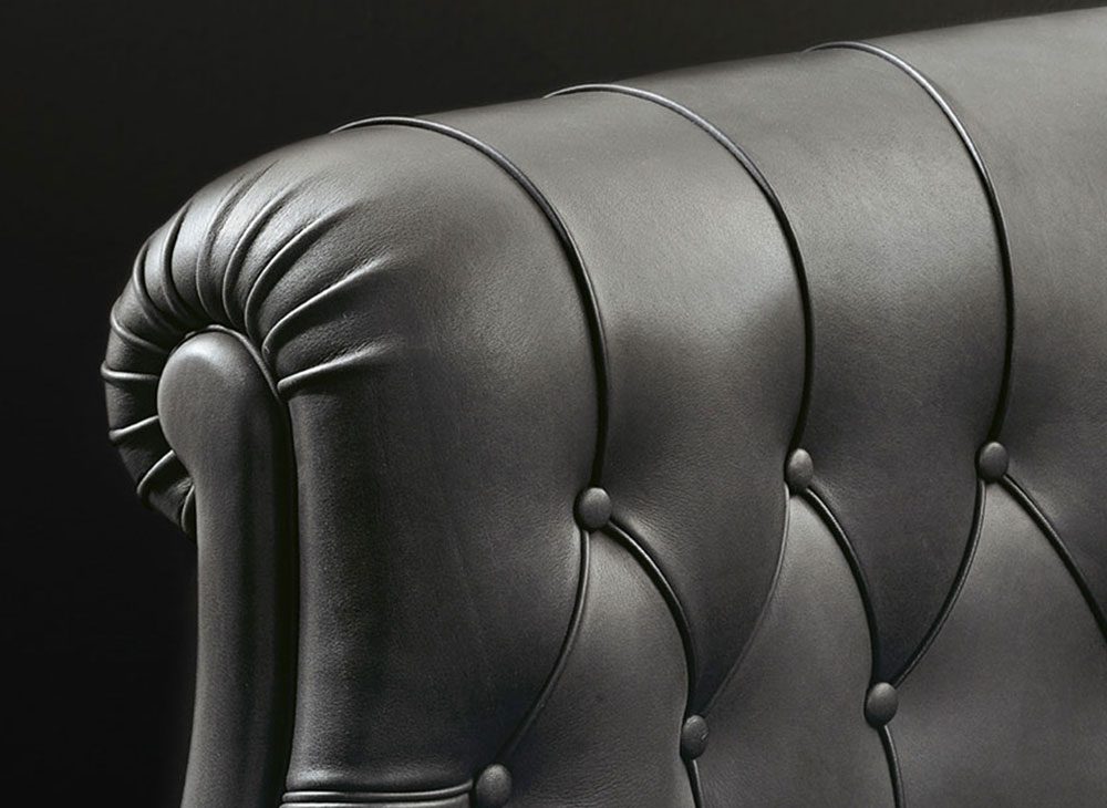 Fumoirシリーズのすべてのアイテムに、真ちゅう製の前輪が付いており、背もたれのダイヤモンドパターンのステッチと革で覆われたボタンが際立っています。革張りのピンの列は、アームチェアとソファの両方の背面と側面を洗練させます。支持構造はブナから作られています。シートスプリングシステムは、ジュートベルトに配置された手で結ばれたスチール製バイコニカルスプリングで構成されています。詰め物はヤシの葉の繊維を乾燥させたものです。張地はレザーまたはファブリックからお選び頂けます。