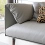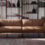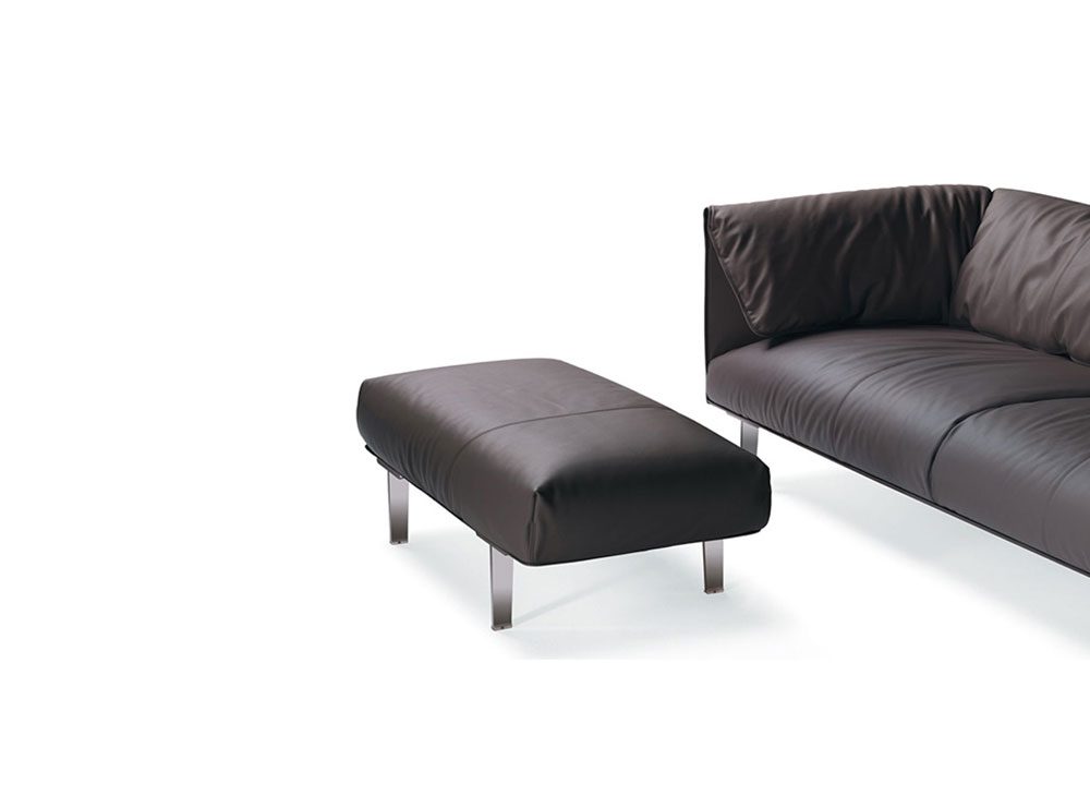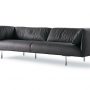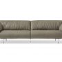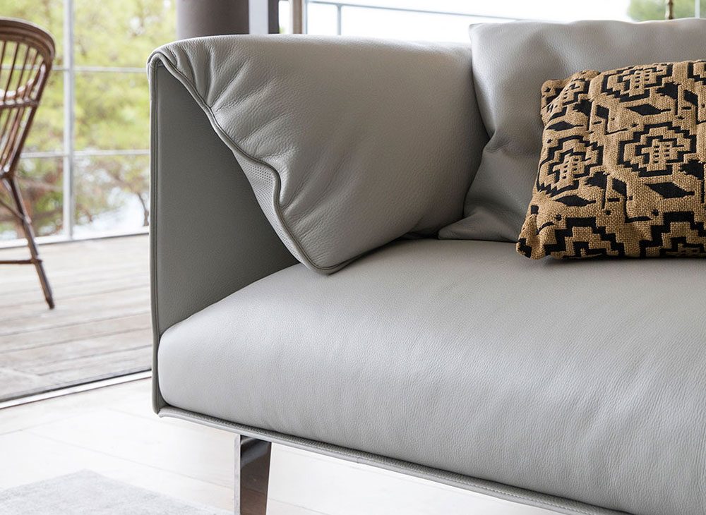 ソファー「John-John」は中央に鉄製の横木を渡したブナ心材の構造で形成されています。発泡ポリウレタンとポリエステル繊維綿のパッド材が入った背面と肘掛は、ポプラとカバの積層板パネルが付いたブナ心材とポプラ心材で形成されています。裏面がマイクロパーフォレイト仕上げのPelle Frau®で覆われたクッションは、パッド材に柔らかなダウンフェザーを使用しており、身体の動きに適応し、ソフトで快適な座り心地を際立たせます。座面のスプリング材は伸縮性バンドで作られています。脚はルテニウム仕上げのアルミニウム製で透明プラスティック素材の脚先保護キャップが付いています。