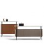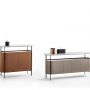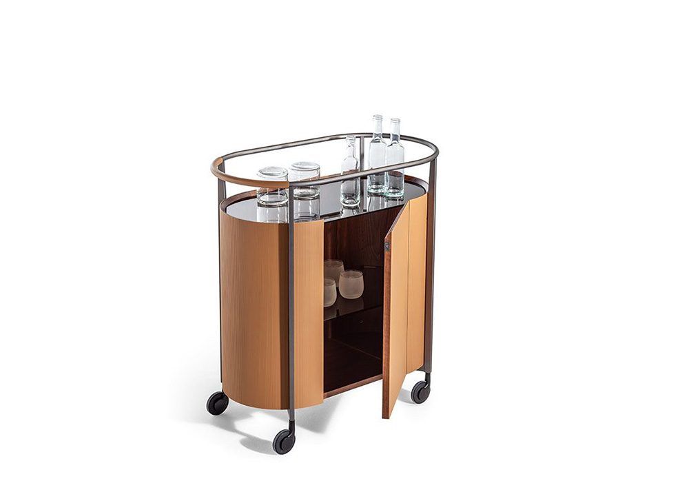リビング収納「Mi」の構造は、ベースとしての機能も持つ、サテン仕上げバーニッシュドスチールで仕上げられた金属フレームで形成されています。家具の両側はポプラ積層板の湾曲パネル、基部と背版は樺積層板です。扉には合板を使用して軽量化を実現しました。収納の内側と底はウォールナット材で化粧張りされています。家具上部と扉の枠はウォールナット材です。2枚扉の食器棚「Mi alta」と4枚扉の「Mi bassa」はいずれも内部の棚板にブロンズ仕上げの強化ガラスが使用されています。またキャビネットを閉じるための上部棚板もブロンズ仕上げの強化ガラスで、ショーウィンドのように中が透けて見える構造になっています。ハイ・キャビネット「Mi」には開閉式の2枚扉が付いています。ロー・キャビネット「Mi」には折り畳み式で2枚ずつ開く4枚の扉が付いています。扉の開閉ロックにはマグネットが使用されています。開き調節式脚が床から構造体を支えています。ワゴン「Mi」のフレームはブラックカラーのスチールまたはプラスチック製タイヤ4個に支えられています。キャリア上部のフレーム端は管状で、サテン仕上げバーニッシュドスチール製、本体と同じフォルムで、取っ手としての役割を果たしています。取っ手の片側はワゴンの上張りとマッチしたSaddle Extraで装飾されており、手縫いのステッチが施されています。内側のスペースには高さが三段階に調節可能な強化ガラスの棚板が付いています。