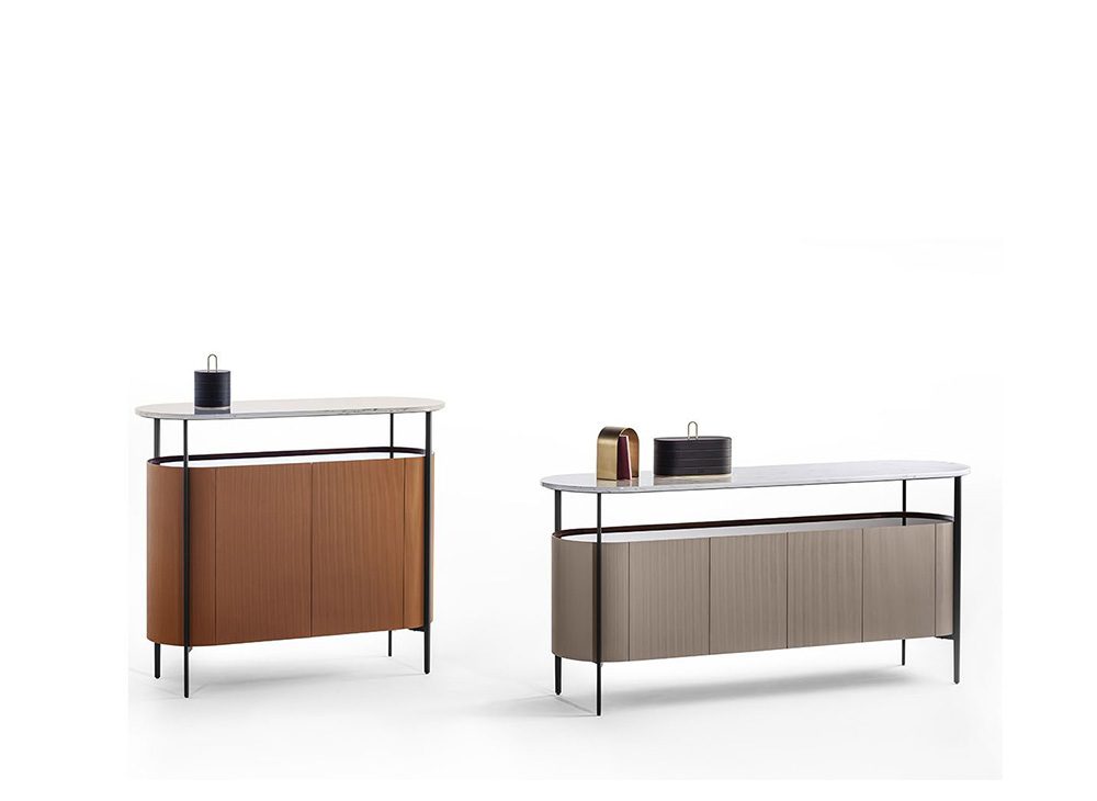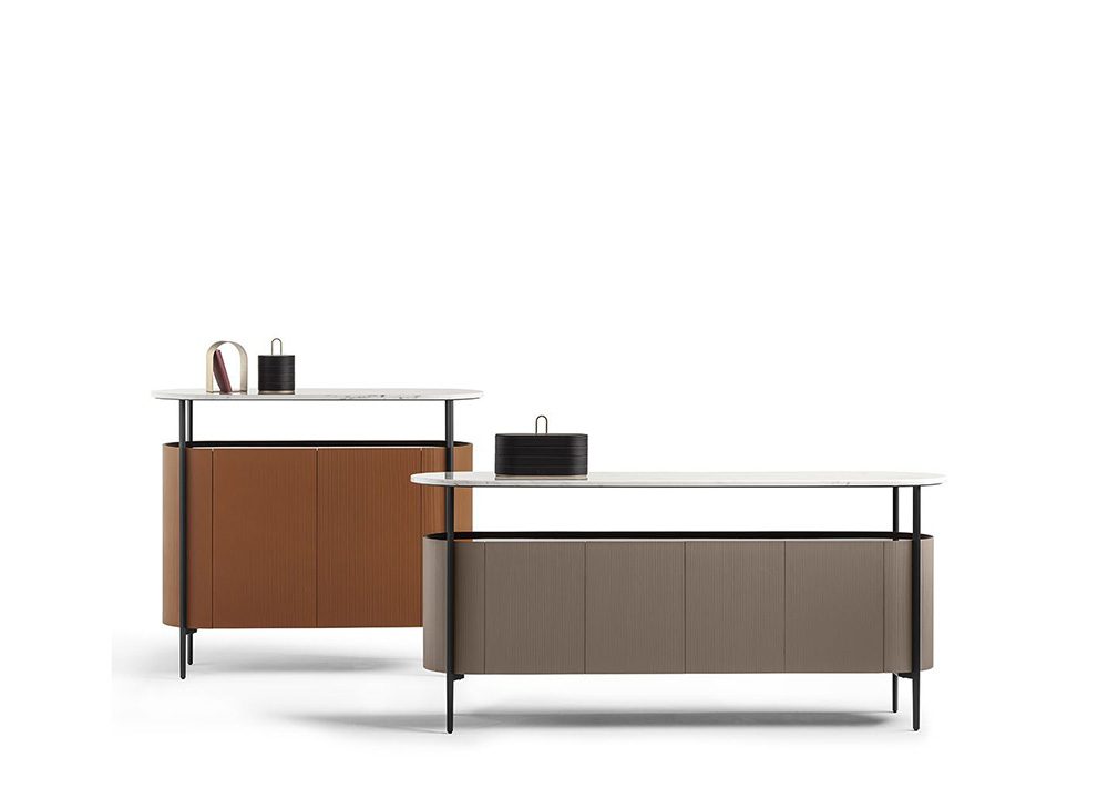 リビング収納「Mi」の外面にはSaddle Extraを使用、グログラン・テクスチャで修飾された最新の縦縞模様が全体に立体感を与えています。薄くて頑丈な金属フレームが家具本体を縁取り、一段高い位置にある天板は、大理石「Calacatta Gold」、または「Marquinia」よりお選び頂けます。