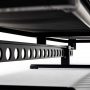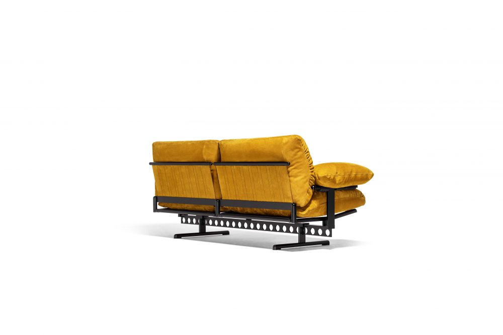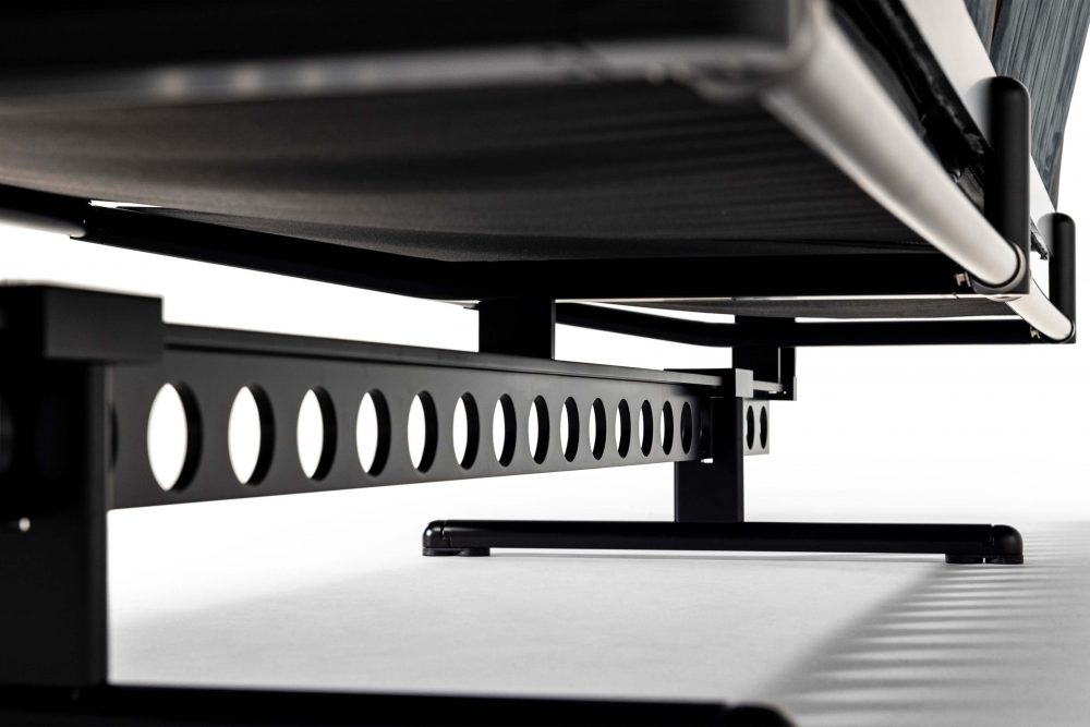 スチール製のフレームが、軽やかでほっそりとした外観を与えています。シートを支える横木から離れた「T」字型ビームによって、パッド部分が宙に浮いているような印象を受けます。溶接されていない支持ビームは、アルミニウムプロファイルによって精巧なはめ込み細工に結合されており、側面のプロファイルからよく見えるようになっています。全てマットブラックのエポキシ粉体で塗装された金属パーツの技術的外観と、クッションの快適さや柔らかさが印象的なコントラストを生み出しています。