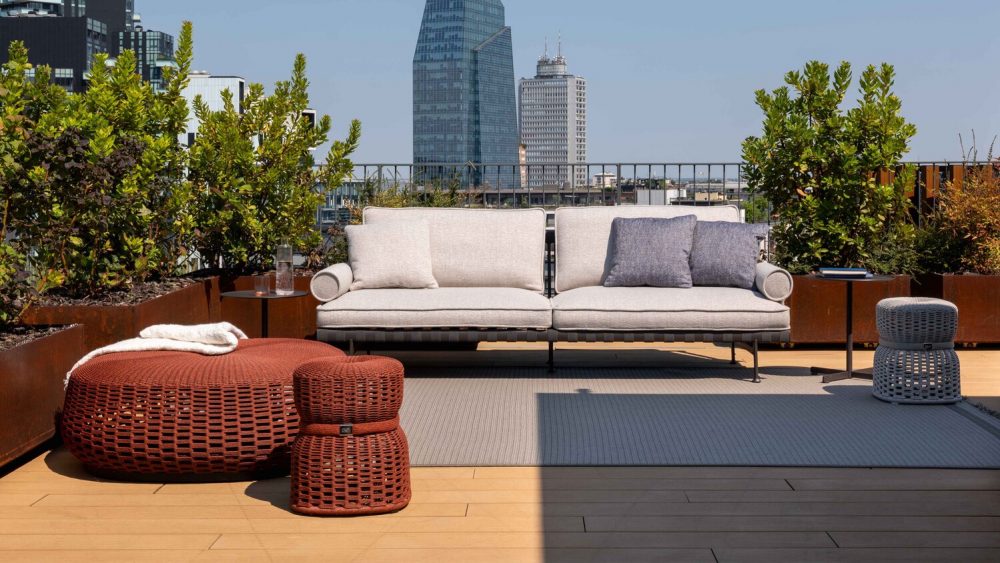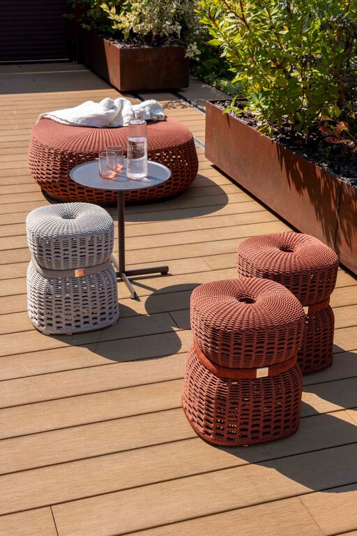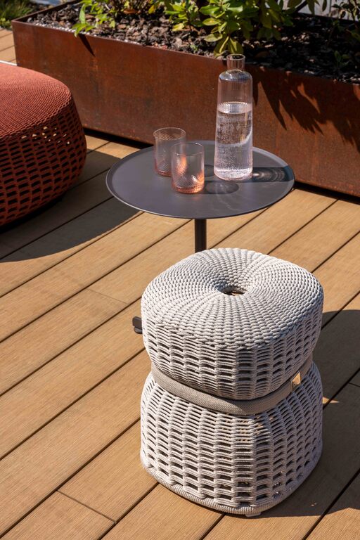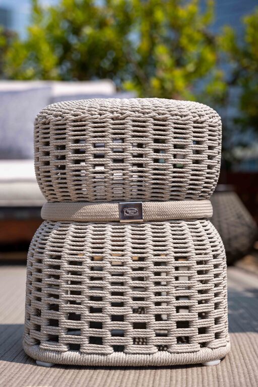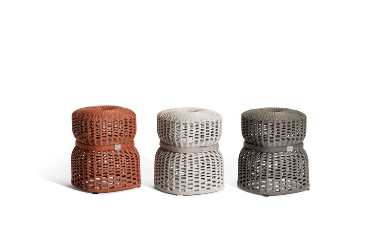 屋外用ランプのSparklerコレクションの特徴である織物のモチーフを加えました。ポリプロピレンの紐がアルミニウムの棒状構造を包み込み、独特の透明感と軽さを生み出しています。色は3色展開となります。軽くて座り心地がよく、移動も簡単なレプリ・アウトドア・スツールは、庭、テラス、パティオ、プールサイド、船のデッキなどのラウンジエリアを個性的に演出します。