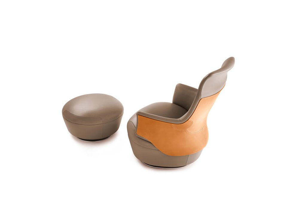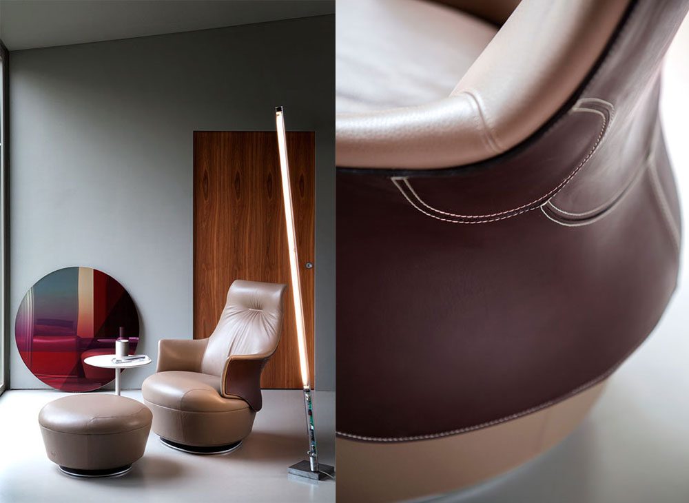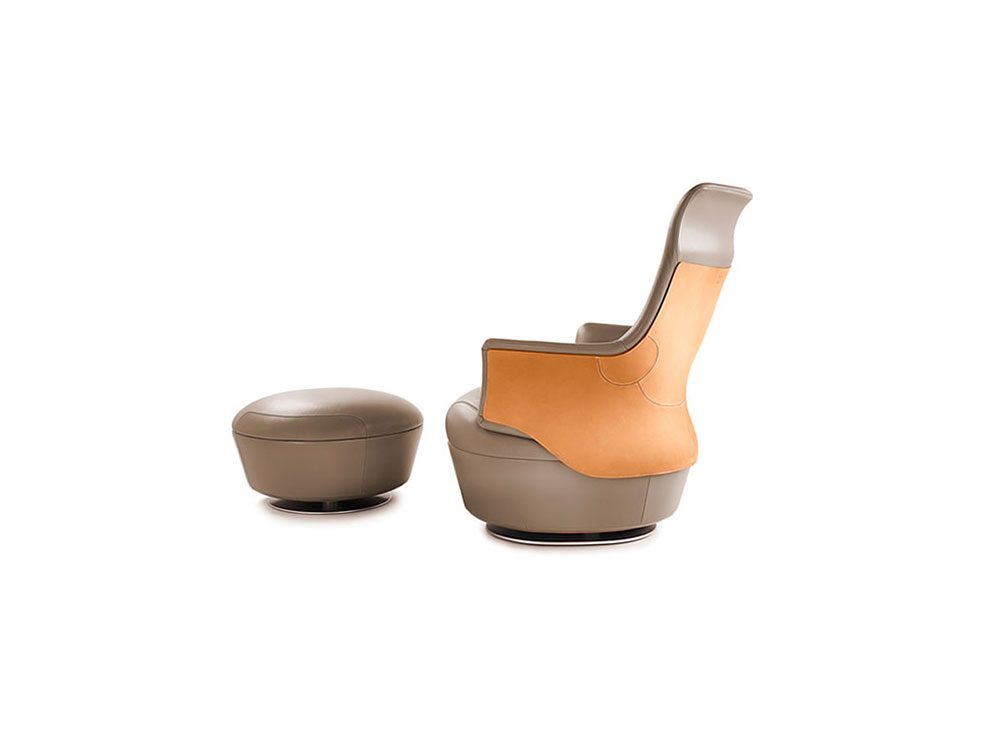 デザイナーは住居空間と仕事場の境界がはっきりと分かれていない途切ることなく繋がった世界をイメージしながら、このコレクション(アームチェア、オットマン、小テーブル)を考案しました。