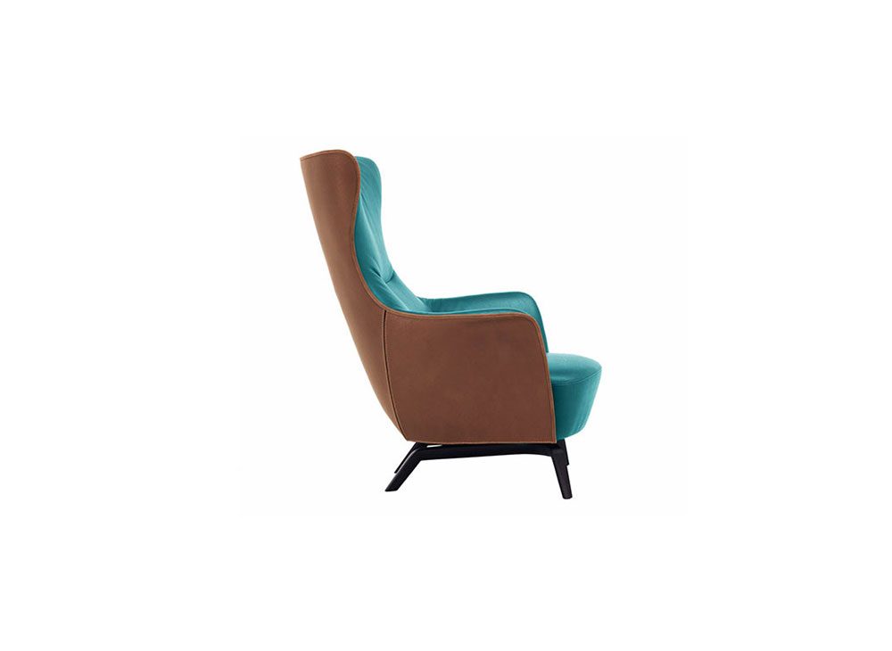 アームチェア「Mamy Blue」では背面の構造に金型成型発泡ポリウレタンが使用されています。熟成させたブナ材の座面のスプリング材には、黄麻布ベルト上に固定された手作業で縛ったスチール製バイコニカルスプリングが使用されています。カバー材は全体がPelle Frau®レザーで覆われたバージョン、あるいはなめし革、レザー、ファブリックと組み合わせたバージョンが可能です。コントラストの効いた糸を使ったステッチが異なる素材のコンビネーションを引き立てます。パッド材に発泡ポリウレタンとダウンフェザーを使用したオプショナルの柔らかなヘッドレストは固定する必要はありません。全体に錘が挿入されていますので、背面のお好きな位置に置くだけです。「Mamy Blue」にはスイベル式アームチェアバージョンもあります。 ウェンゲーカラーまたはモカカラーに染色されたブナ心材の4本スポークベースが付いています。プーフ「Mamy Blue」の構造には熟成させたブナ材とカバの積層板が使用されており、アームチェア同様、全体がPelle Frau®で覆われたバージョンとファブリックと組み合わせたバージョンがあります。