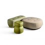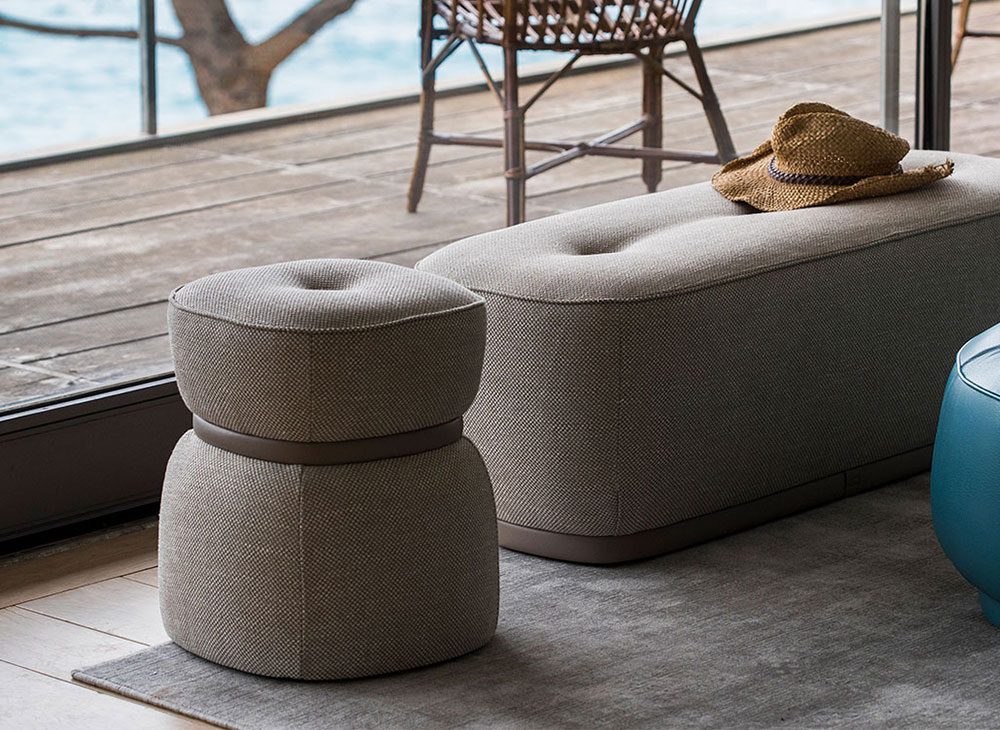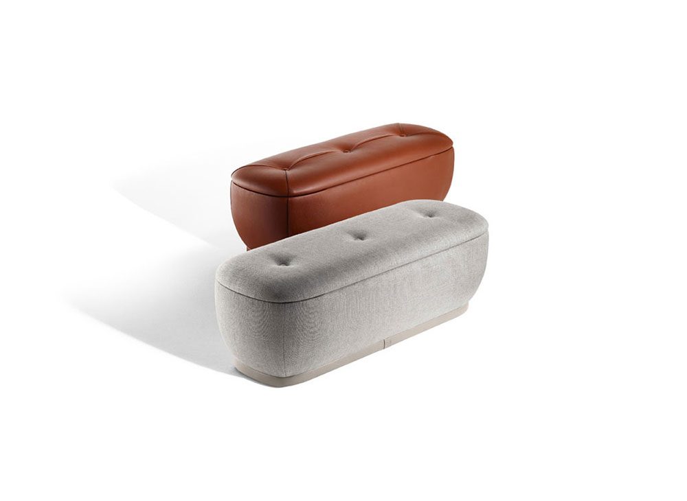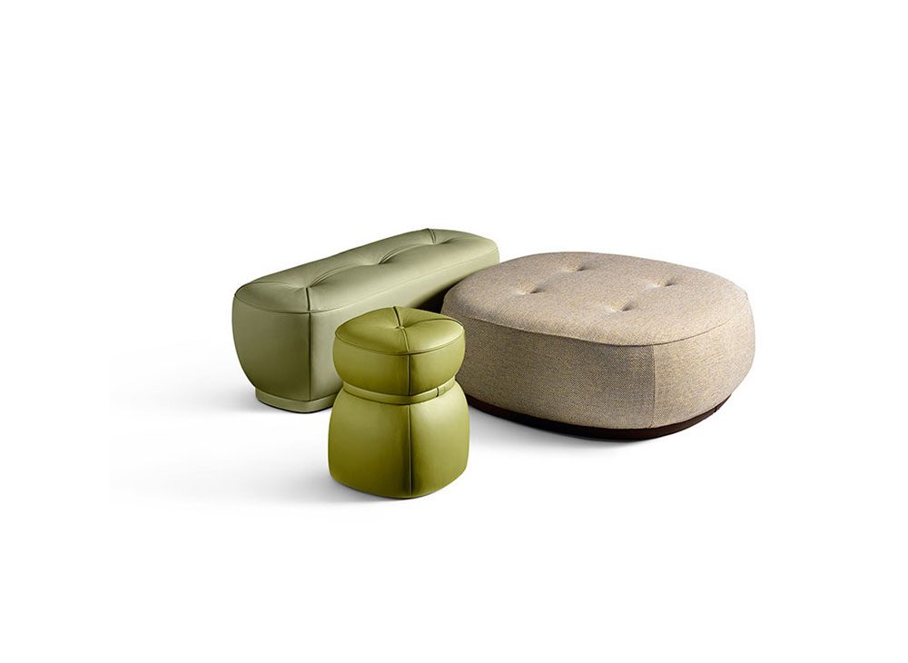 「Leplì」はスツール兼ベンチ兼プーフです。大城健作は万能でありながら強いアイデンティティを持つ4つの作品をデザインしました。デザイナーはPoltrona Frauの伝統的な装飾と細工から着想を汲み取り、イタリアンファッションのテーラードの要素と融合しました。クラシックなキルティング細工と柔らかなプリーツがデザインの波状の形を引き立てています。スツールのしなやかなカーブは女性らしいシルエットやワンピースにおけるウェストを引き立てる細いベルトを彷彿させます。