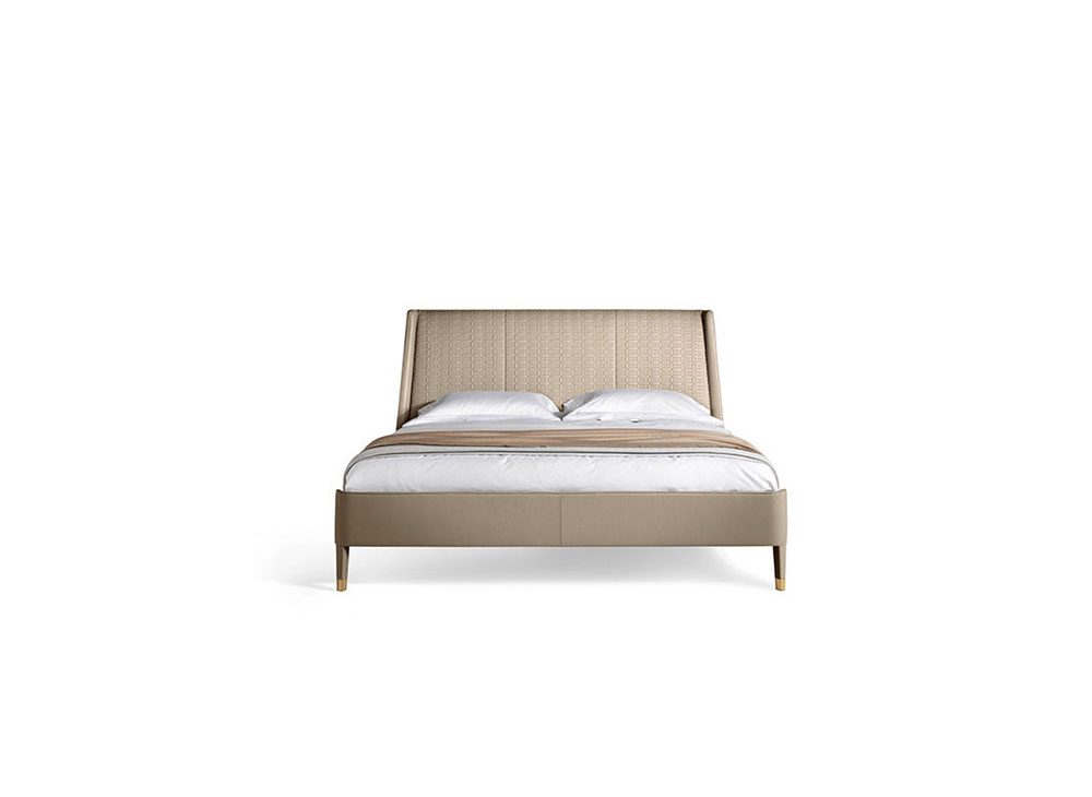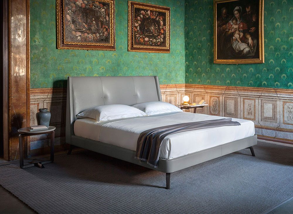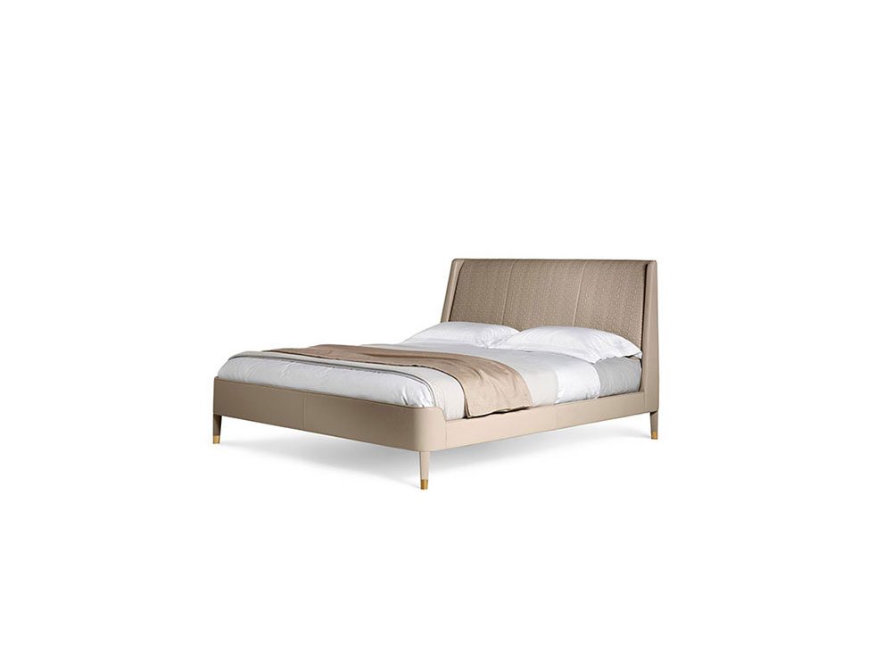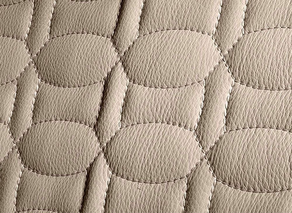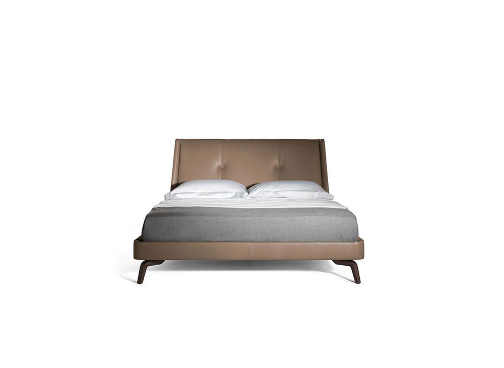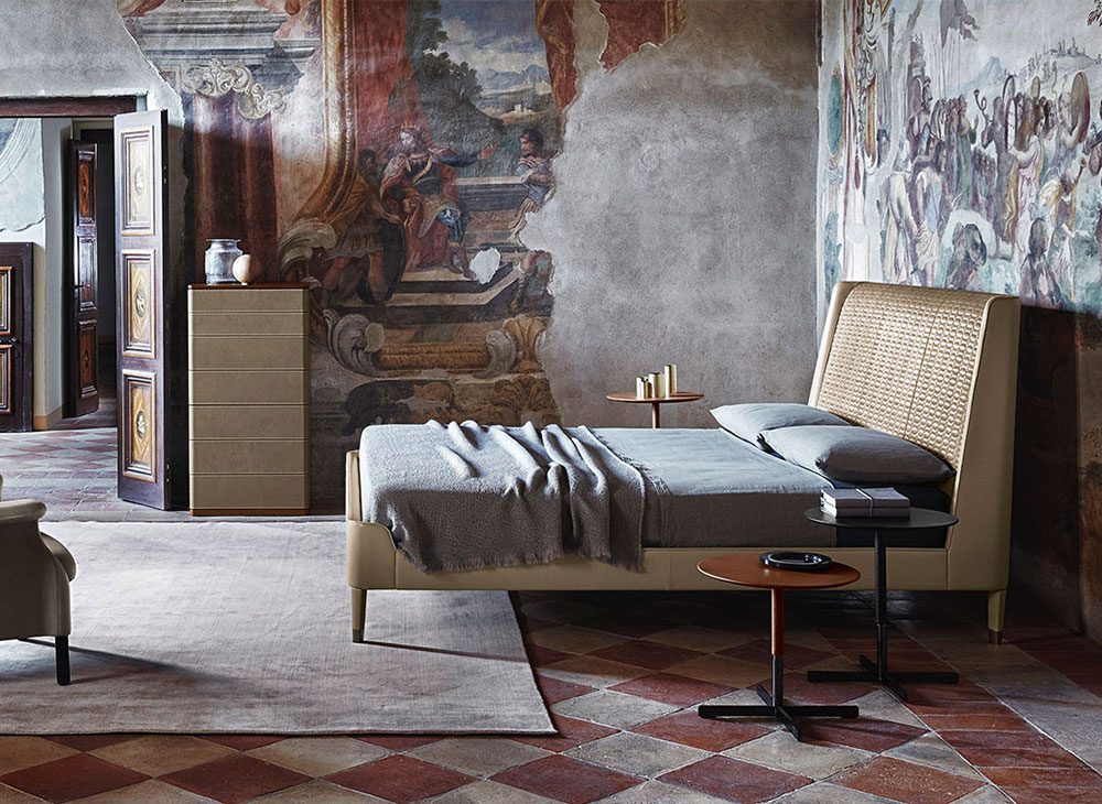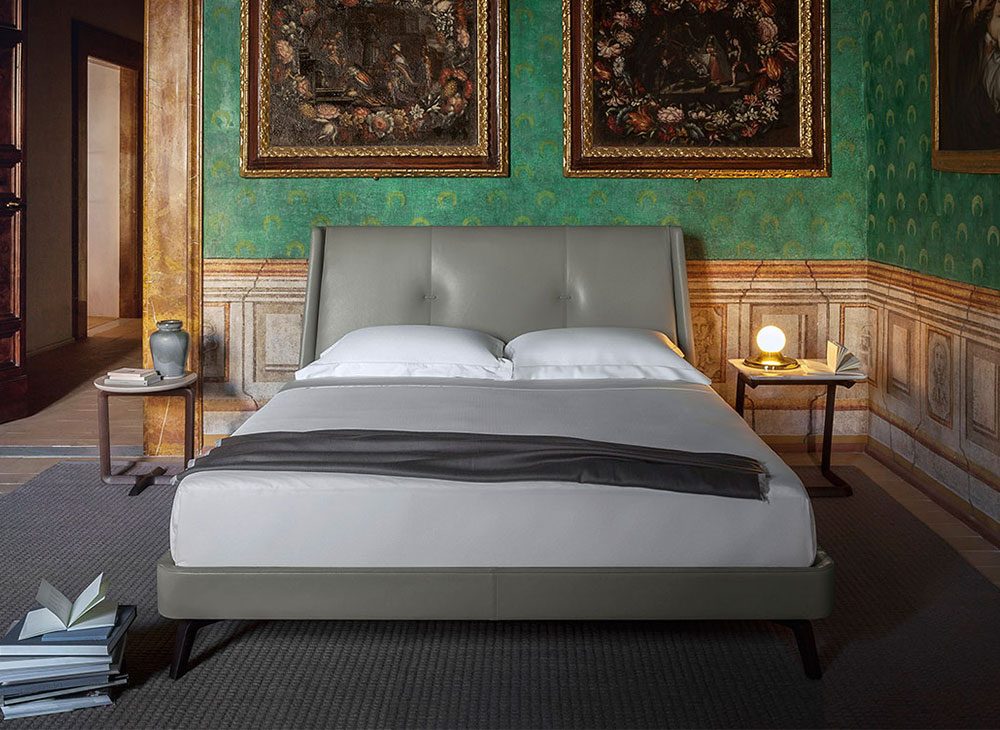ベッド「Suzie Wong」のベッドボードのフレームにはブナ心材とカバの積層板を使用されており、発泡ポリウレタンのパッドが入っています。ヘッドボードには3バージョンあります:キルティング細工のない無地のヘッドボードを特徴とする「Suzie Wong」、トーンオントーンのレザーでコーティングされた一対のシリンダー型ボタンで装飾された無地のベッドボードを特徴とする「Suzie Wong Extra」、幾何学模様を描くステッチで装飾されたヘッドボードを特徴とする「Suzie Wong De Luxe」。両サイドの2枚のパーツは金型成型発泡ポリウレタンで作られています。サイドフレームはトウヒ材の薄板で発泡ポリウレタンの薄いパッドが入っています。フッドボードはポプラ積層板で、両側の角には金型成型発泡ポリウレタンが使用されています。カバーはPelle Frau®です。真鍮またはガンメタルカラー仕上げの先端が付いた革張りの先細の脚の他に、モカカラーまたはウェンゲーカラーに染色されたトネリコ心材の脚もあります。フットボードもサイドフレームの延長上に一体化されているタイプと、サイドフレームと高さが異なるタイプがあります。
