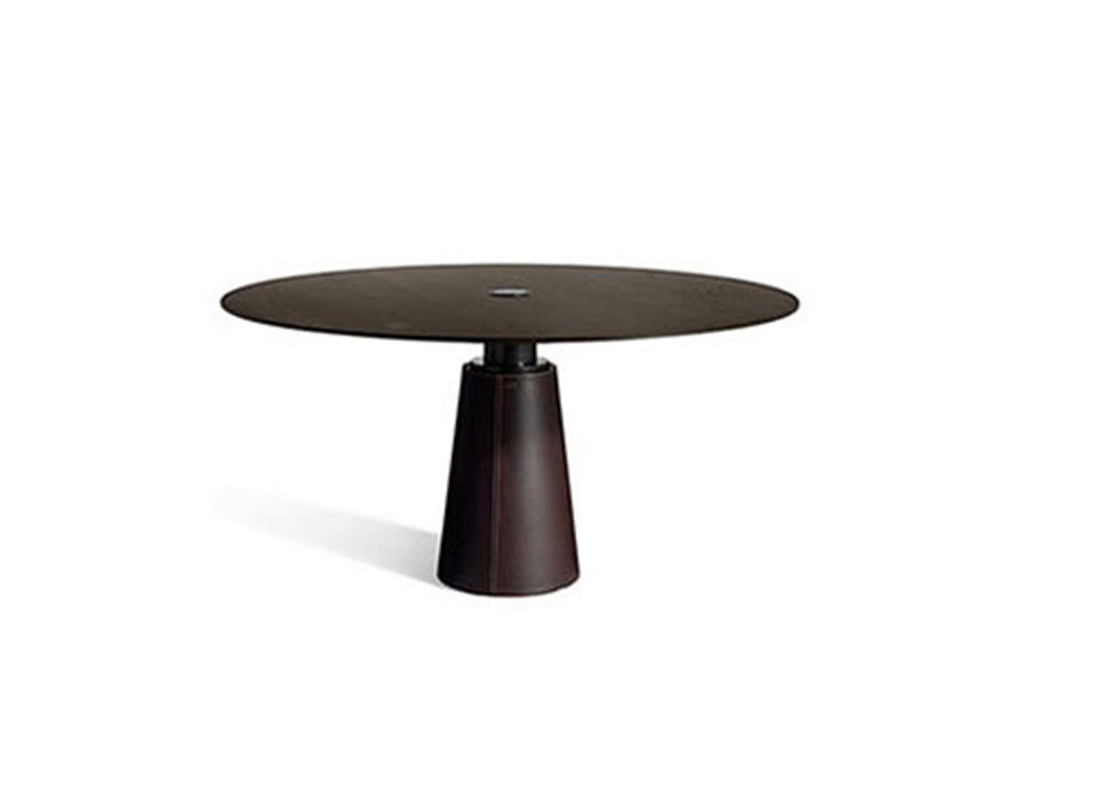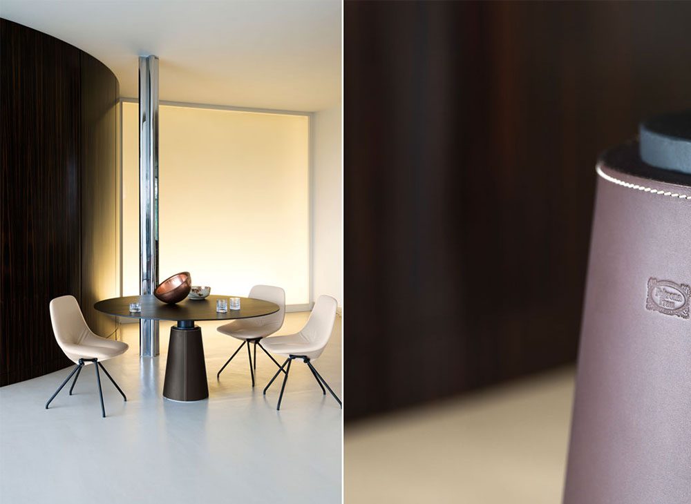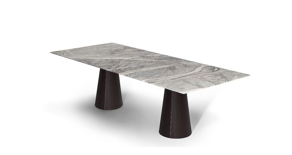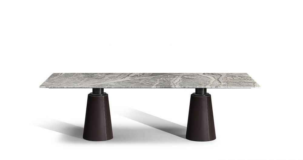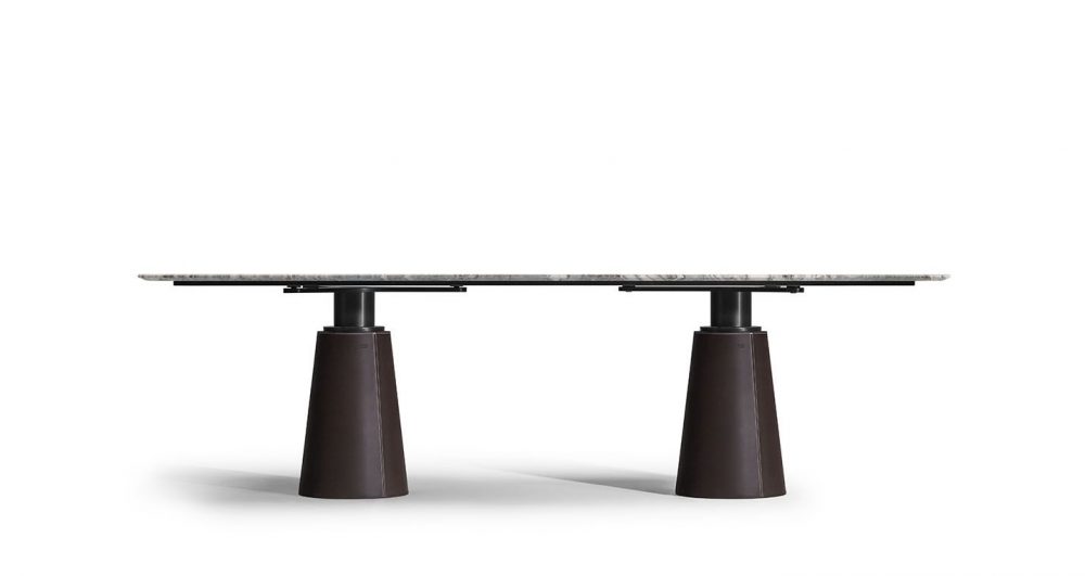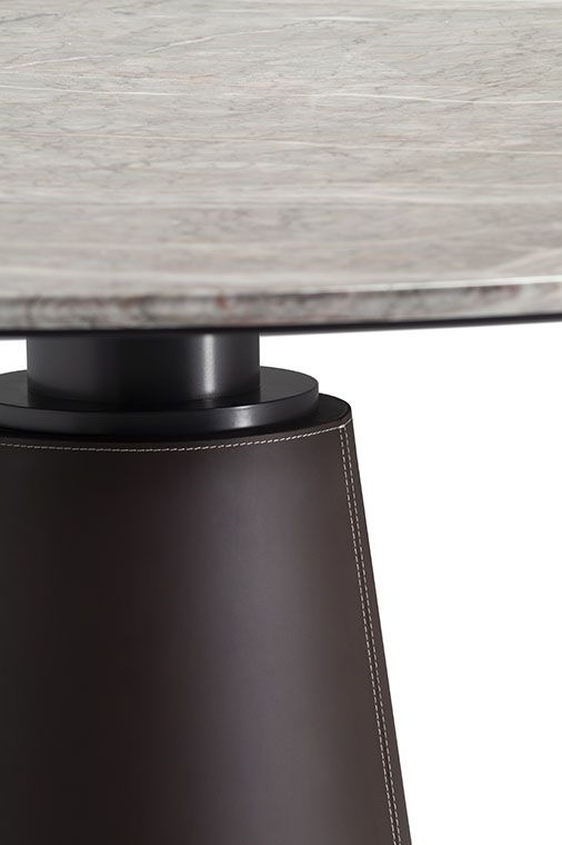 、もしくはPelleFrau®レザーで装飾されています。Mesa Dueのベースは、グレーのピエトラセレナ、コントラストステッチのCuoio Saddle Extraレザー張りのスチール、またはトーンオントーンステッチのカラーシステムのPelleFrau®レザーにすることができます。スチールベースは、内部カウンターウェイトの特別なシステムのおかげで安定したままであり、床を保護するために底部にプラスチック形状の先端があります。上部と柱の間の接合部は、「nero bruno」で塗装された管状鋼でできており、3つのブラケットの接合プレートに調整可能なサポートが取り付けられて表面を水平に保ちます。