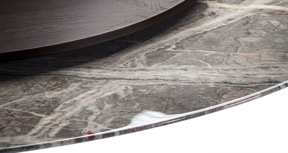飽きの来ないデザインで様々なシーンでお使いいただくことが出来ます。直径135cmのメサテーブルモデル、スレートトップ、ピエトラセレナの耐荷重柱に、さまざまな用途を提供する新しいサイズが加わりました。メサデュエモデルは直径150cmのダイニングテーブルと直径120cmのビストロサイドテーブルとして提供されます。テーブルトップは、ウェンジまたはモカで染色されたカットアッシュ材突き板を使用したMDF