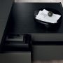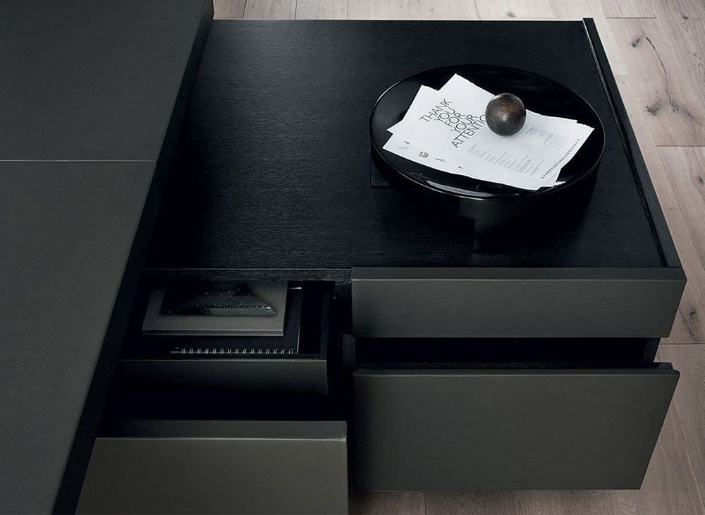 引き出しのフロントパネルはPelleFrau®レザーで覆われ、内部はスクラッチプルーフのブラックペイントです。
