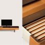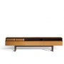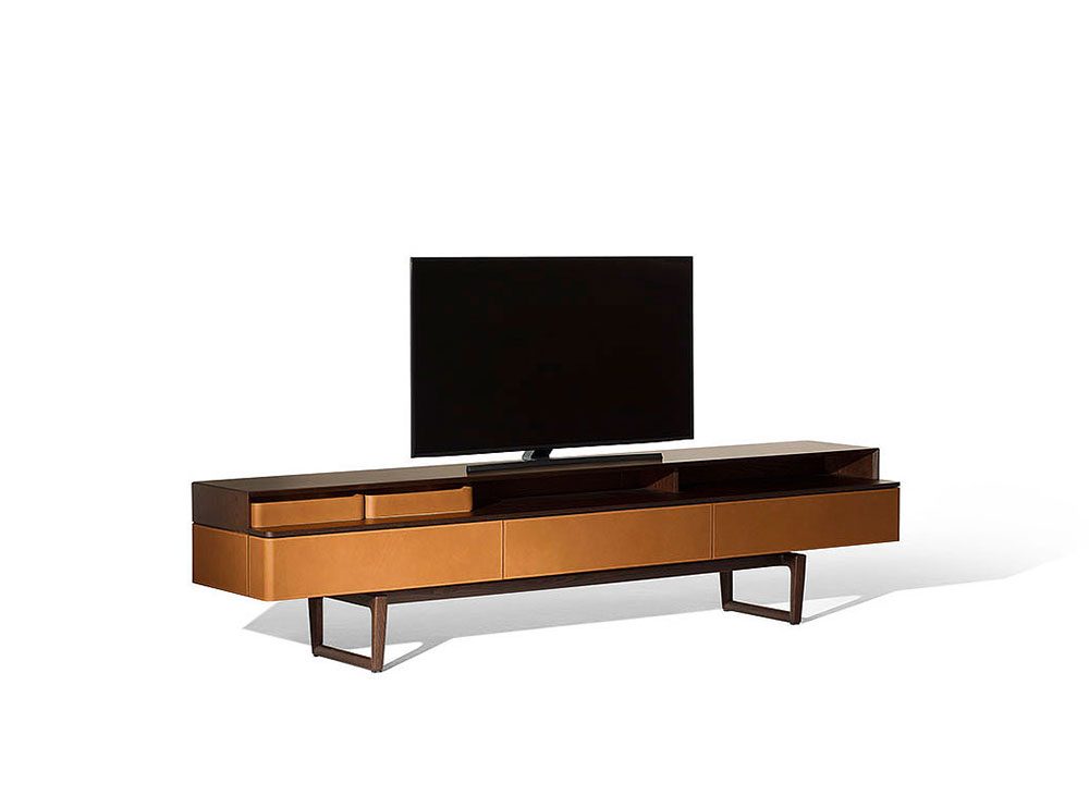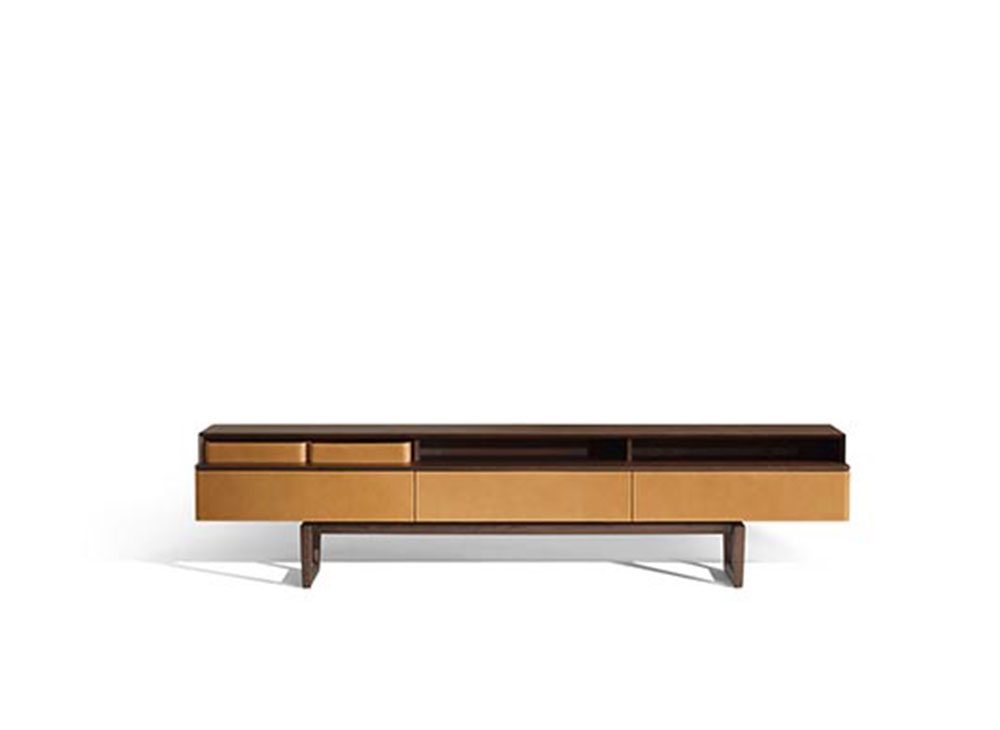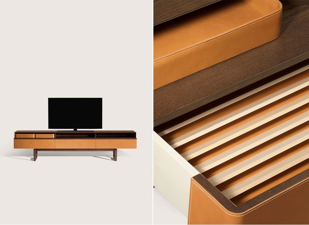 大きなベースを持つこのキャビネットは、上部に3つのオープンコンパートメント、下部に3つの広々とした引き出しを備えています。視覚的な開放感と軽さの感覚は、三角形の断面を持つモカ色のアッシュ材のイーゼルベースによって強調されています。素材と仕上げの組み合わせは、上品な明暗の効果で洗練されています。クオイオ・サドルまたはクオイオ・サドル・エクストラ・レザーとコントラストまたは同系色のステッチで装飾された引き出しを開けると、エクストラ・クリア・ナチュラル・メープル材の突板の輝きが見えてきます。支持構造、トップとFidelioマルチメディアキャビネットのオープンコンパートメントは、バーチ合板とソリッドアッシュにモカ染色されたアッシュの突板で構成されています。