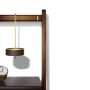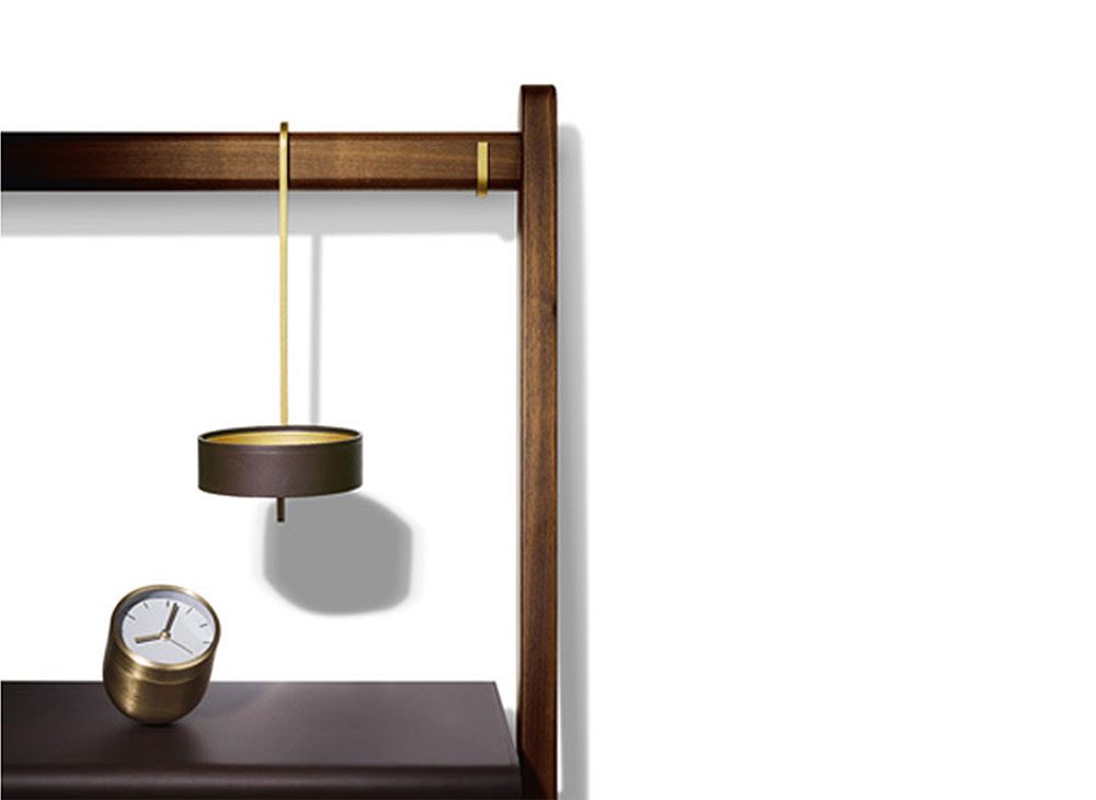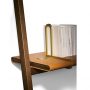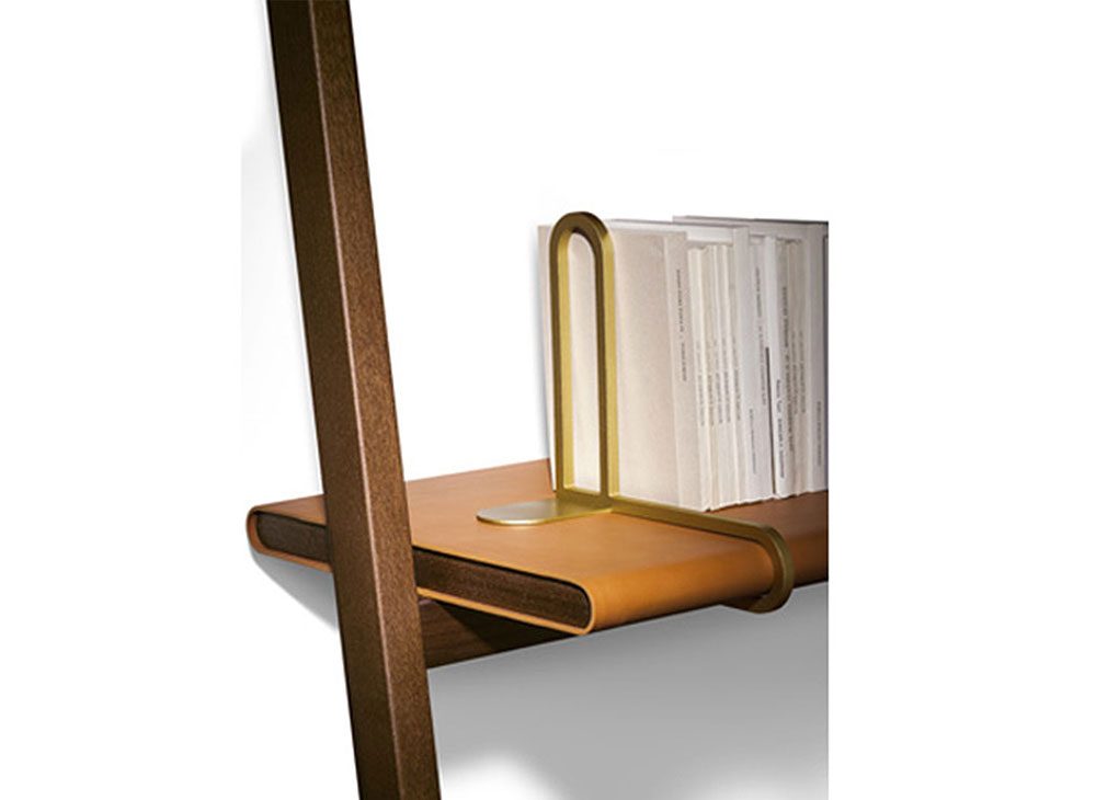 書棚「Ren」のやや傾斜した両側の支柱が化粧張りされたカバ積層板の棚板を支えています。棚板の両端は黒クルミ製でなめし革Saddle Extraでコーティングされています。ナチュラルブラス仕上げの金属製固定フックを使って上部の横木を壁に固定します。書棚には背が低いバージョンと高いバージョンはあります。低いバージョンでは小物用のなめし革張り円形トレーが横木から吊り下げられています。2つのバージョンでは高さ、幅、棚板数が異なります。どちらのバージョンでもナチュラルブラス仕上げブラッシュスチール製のブックエンドを追加することが出来ます。