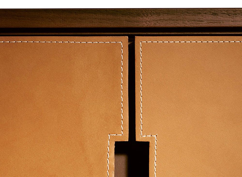 引き出し外側と両サイドはサドルレザーで仕上げられ、トーンオントーンまたはコントラストの効いたステッチが入っています。