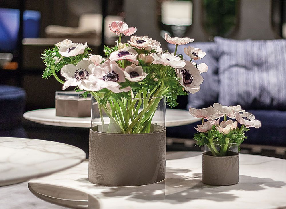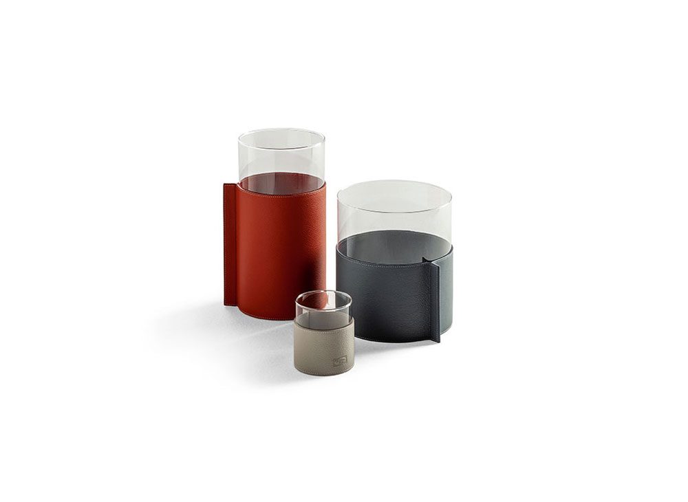 「レザーポット」: ガラスの透明感とレザーの柔らかさを備えたコンテナのシリーズ。自由に組み合わることも、単体で使うこともできます。Poltrona Frauのサインが入ったコンテナ「 Leather Pot」は、サイズの異なるシンプルな円筒形の透明ガラスの容器3種類と全体がPelle Frau®で上張りされたカバーで構成されたシリーズです。カバーは手を握りしめたような形で円筒形のコンテナを包みこんでおり、そのユニークな形がこのコレクションの特徴になっています。コントラストの効いたステッチで模様が描かれたPelle Frau® Nestのカバーは、ラリマー、マルテ(火星)、サルジェンマ(ロックソルト)のカラー・展開です。コンテナ「 Leather Pot」の縁のカラーは同系色、手作業で塗装仕上げされています。