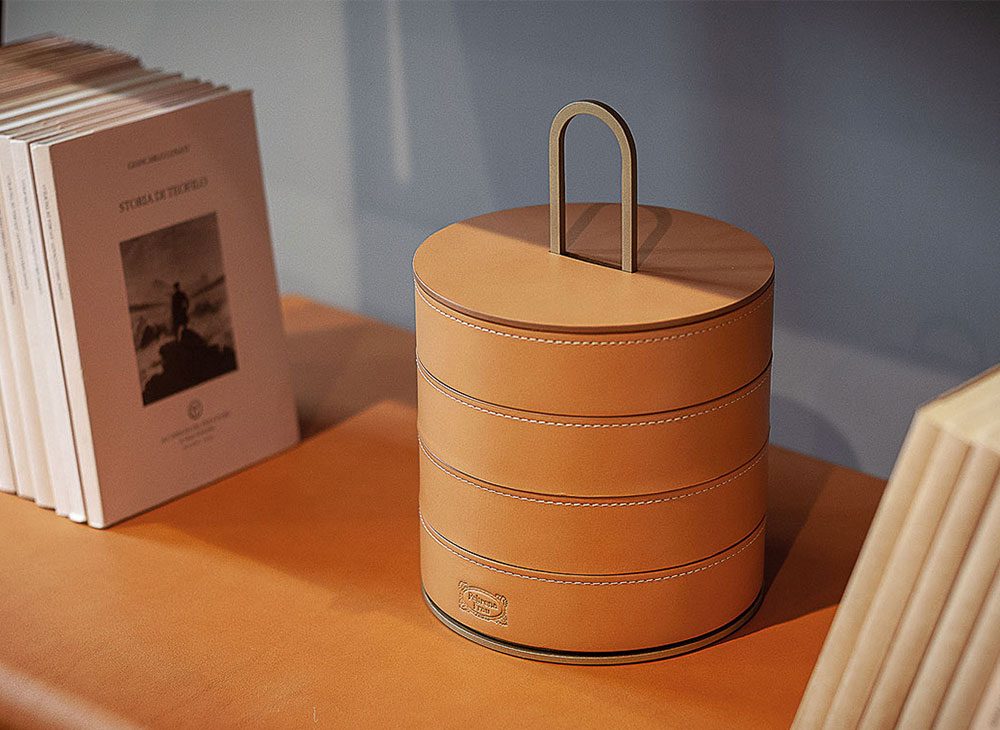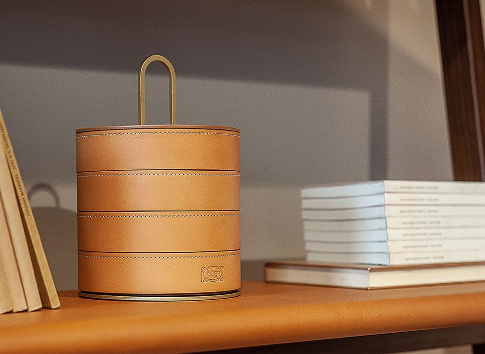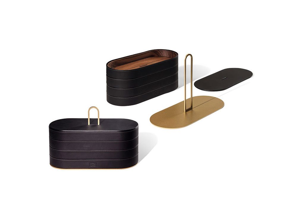 「Zhuang 」シリーズの容器は全て黒クルミ心材を数値制御によるコンピュータ加工で彫り出し、カーボンカラーとキャメルカラーのなめし革 Cuoio Saddle Extraのベルトで仕上げられています。なめし革には、皮革製品に使用する、ややコントラストを効かせた糸による細かなステッチ装飾が施され、Poltrona Frauの印が焼き付けられています。