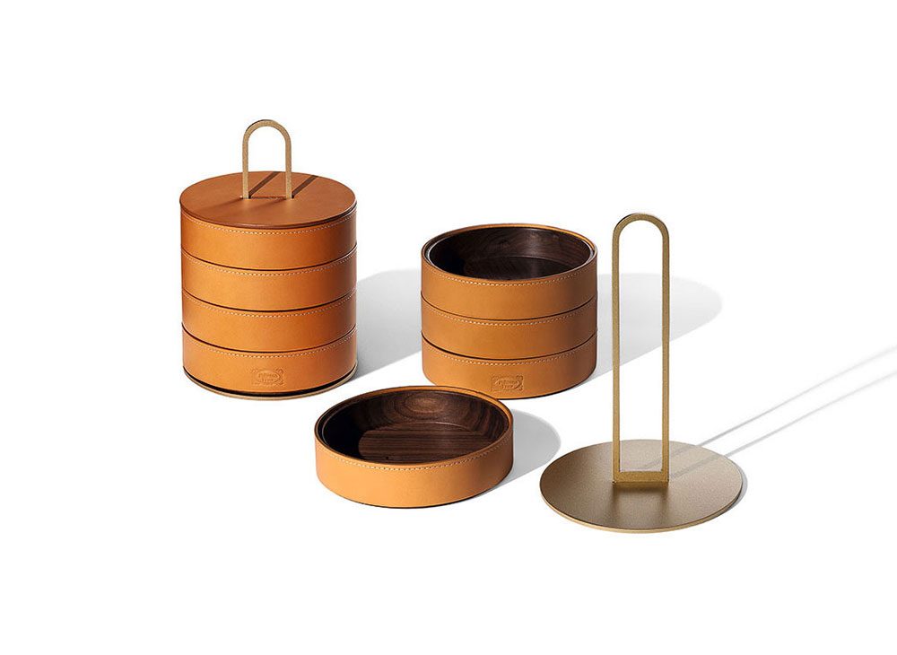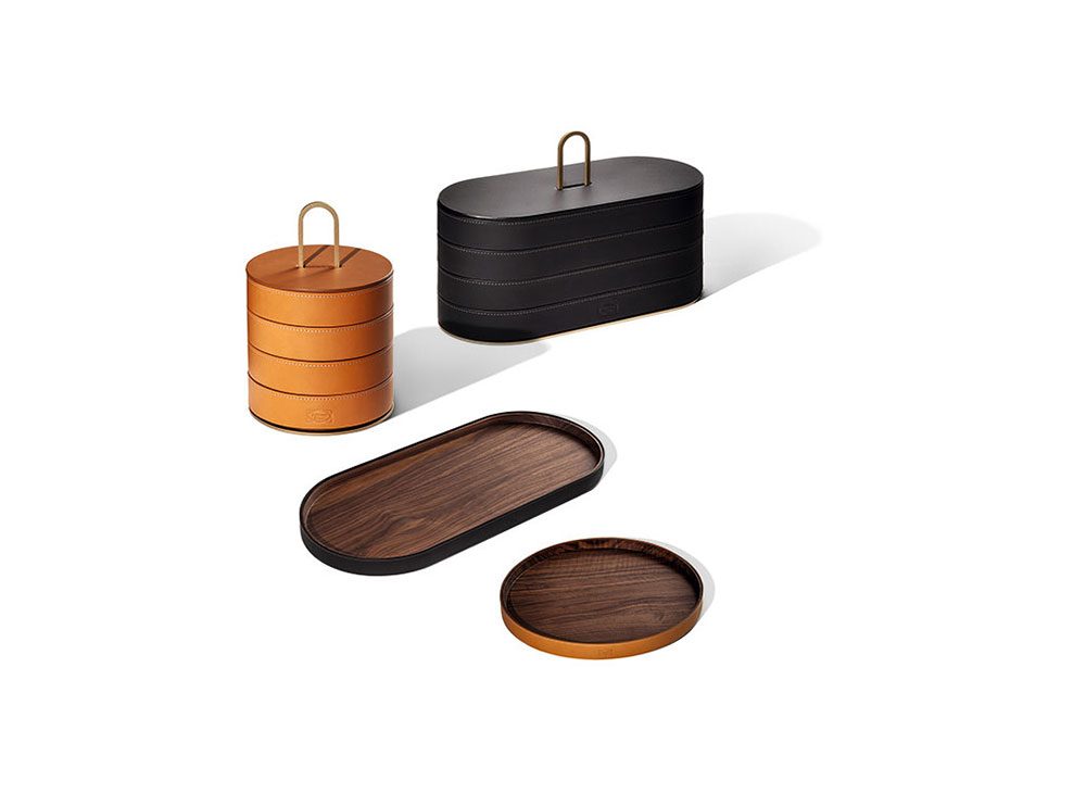 ‘zhuang’ という言葉は中国語で、「何か貴重な品を大切にしまっておく」という意味です。デザインスタジオネリ&フーによるこの入れ物シリーズ「Zhuang」は、ミニマルで超現代的なデザインの小さな宝石箱を集めたもの。円形または楕円形の重ね式の2つの箱がなめし革のカバーに包まれています。さらに、その箱のひとつひとつが、積み重ねられた4枚のトレーで構成されています。この4枚のトレーは1枚1 枚抜き取れるようになっていますが、マットなサテン仕上げのナチュラルブラスカラーのアルミニウム製ベースにひとまとめに収められています。同コレクションにはこの他に同じ幾何学的フォームを持つ大型トレー2枚があります。「Zhuang」シリーズの箱やトレーは、リヴィングや玄関、寝室などどこでも好きな場所に置いて、貴重品や共用のアイテムを収納してください。使い勝手に優れた取っ手はアジアで日常使いされている入れ子式のクラシックな容器を思わせて、ご家庭に新しいしきたりが生まれそうではありませんか。