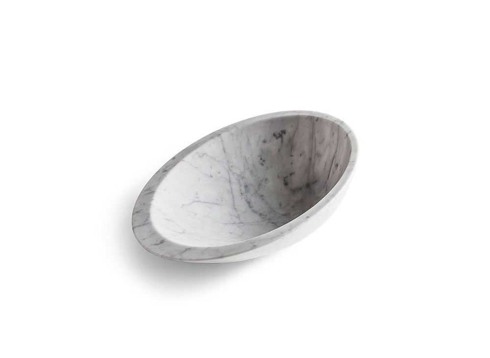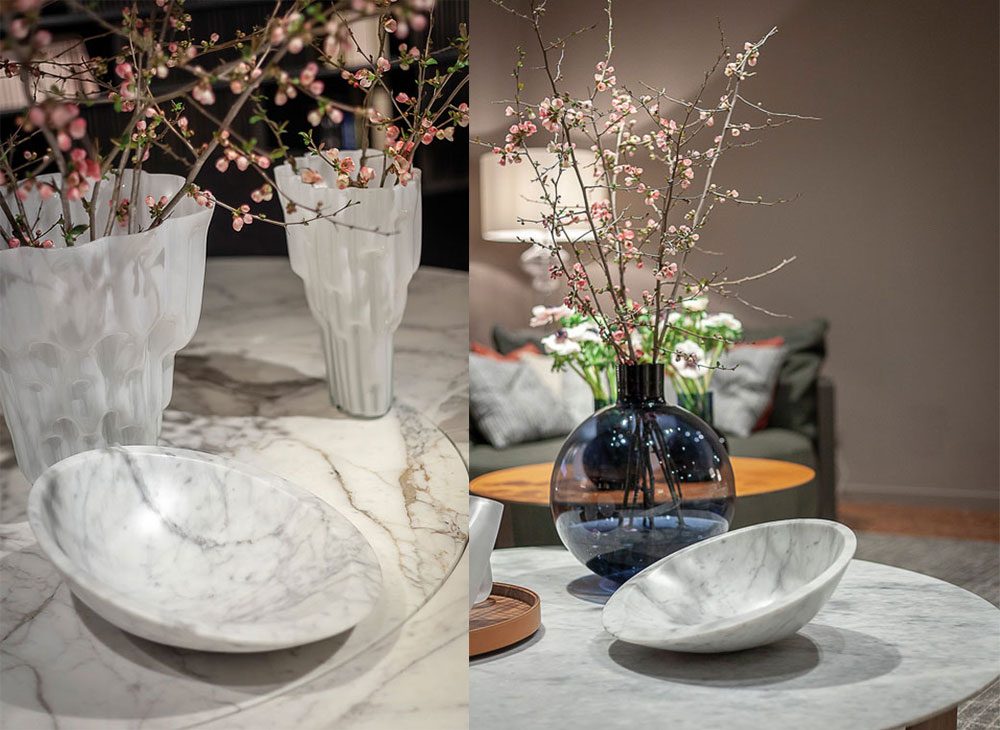 アンジェロ・マンジャロッティのひらめきに満ちた彫刻的なデザインを表現した、タイムレスな魅力を持つ2つのオブジェクトです。カッラーラの白大理石で彫られたボウル「Pura」は1988年にデザインされたクリスタルのバージョンをPoltrona Frauのために復刻したものです。微妙な厚さの違いが大理石の肌理を際立たせています。薄い箇所と厚い箇所の光の透け方の違いが、素材の持つ透明感と不透明感を引き立てます。ボウル「Pura」では、“空”と“満”のバランスから生まれたアシンメトリーなフォームによって、ボウル自体がごく自然に片側に傾いています。大理石は、まず数値制御を活用し、その後に手作業で研磨することによって、半光沢仕上げを施し、自然な外観を保っています。ボウル「Pura」の下側のルテニウム仕上げを施した真鍮製の円形プレートにはマエストロのサインとPoltronaFrauのブランド印が刻まれています。