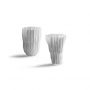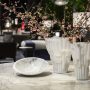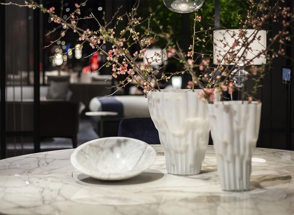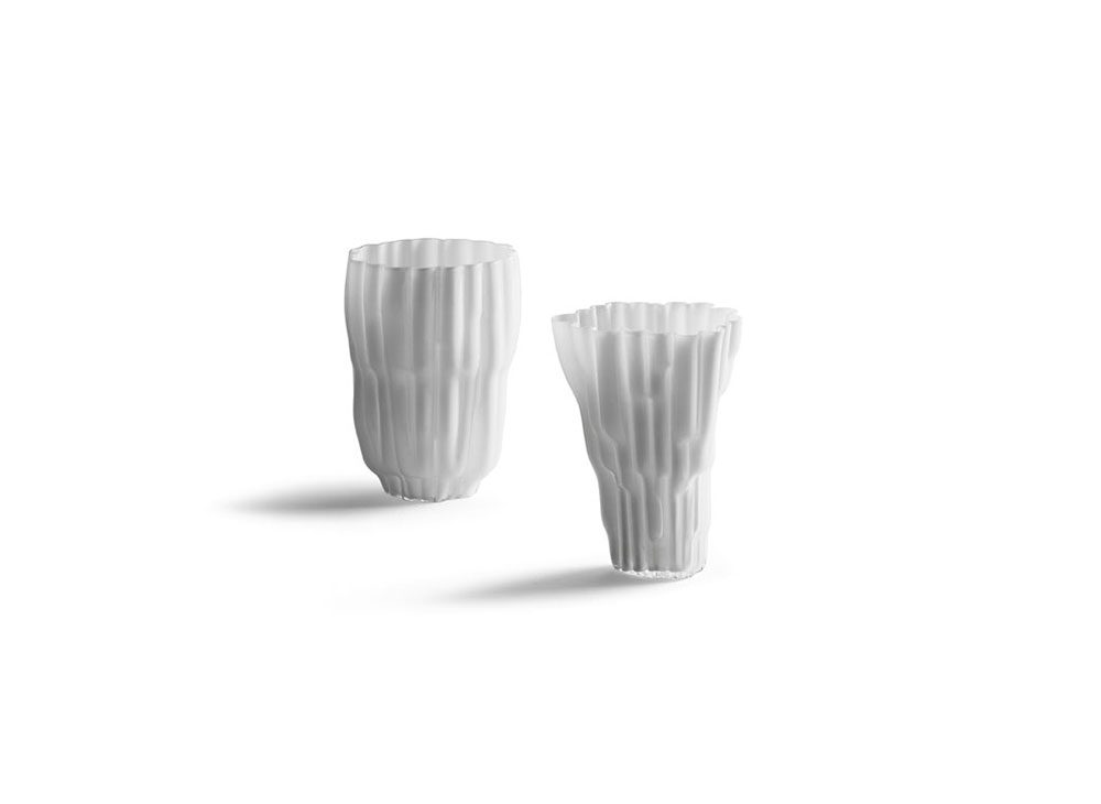 デザインはミケーレ・デ・ルッキ。Poltrona Frauが 2種類のモデルで提案する器「Marianne」にはふたつと同じものはありません。どれもデザインが生んだ、真の吹きガラス芸術の常として、一点ものです。薄いスチール製板の開放的な型を使ってガラスを吹きます。吹く力を加えると、煮えたぎったガラスが薄いスチール製板の間から押し出されるのですが、そのときどきで違う動きが生まれるので、できあがる器のフォームも、わずかに、しかし目に見えて違うのです。器「Marianne」の乳白色の仕上げは焼き戻しに際してホワイトカラーのガラスの層を透明なガラスと合わせて生み出されたものです。