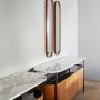 「Ren」ミラーは、円形ミラー(Ø430 mm)または楕円ミラー(280 x 1200 mm)のバージョンと、別に、テーブルバージョン(Ø310)がお選びいただけます。真鍮製のフレームにはサドルエキストラレザーが掛けられており、バックはカナレットウォールナットベニヤ付きのバーチ合板を使用しています。