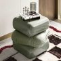 大胆で個性的なデザインのミニテーブル「Squash」は、ラッカー塗装が施されたウッドブロックとふたつのブロック、そしてその中央に配されているブロックと同色のColorSphereのFrau®レザーカバーのついたクッションが特徴です。ミニテーブルのカラーバリエーションは、クリーム、セージ、ブルー、ブラウンの4色となっています。さらにオプションとして、ミニテーブル中央のクッションに合わせたColorSphereのFrau®レザー製ミニラグマットもご用意しております。