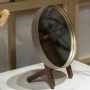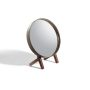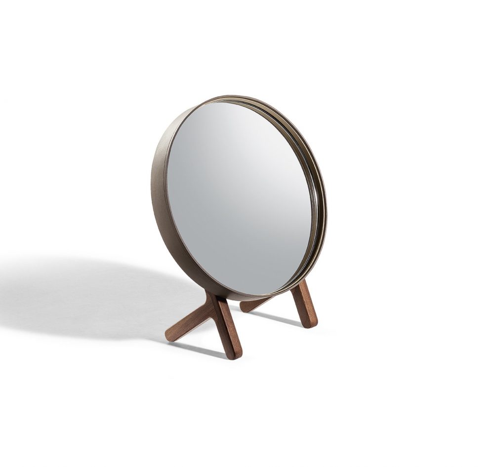 「Ren Table mirror」は、直径 310 mm の円形で、外側が革で覆われた真鍮のフレームが特徴です。背面には、カナレット ウォルナットのベニヤ張りのバーチ合板パネルが使用されています。洗練されたシルエットは、お部屋を飾るオブジェとしてもお空間を演出いたします。