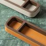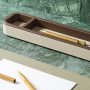しなやかな Pelle Frau® レザーを使用した、この洗練された平らな木製ペンホルダーを使えば、デスク上でペンが転がるのを防ぎます。中央のペン収納部には 2 つの小さな側面収納部があり、ペーパークリップやその他の小さな文房具を収納するのに最適です。カラーバリエーションも豊富です。