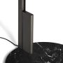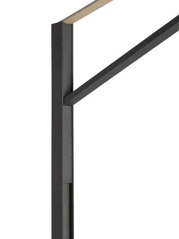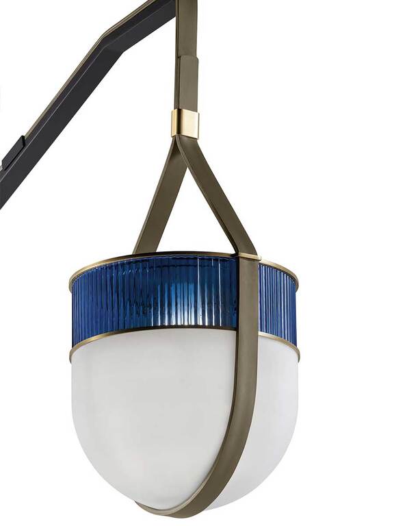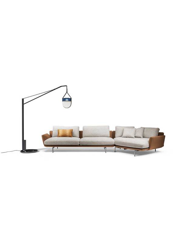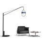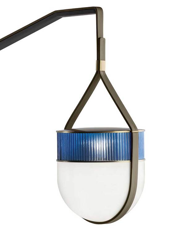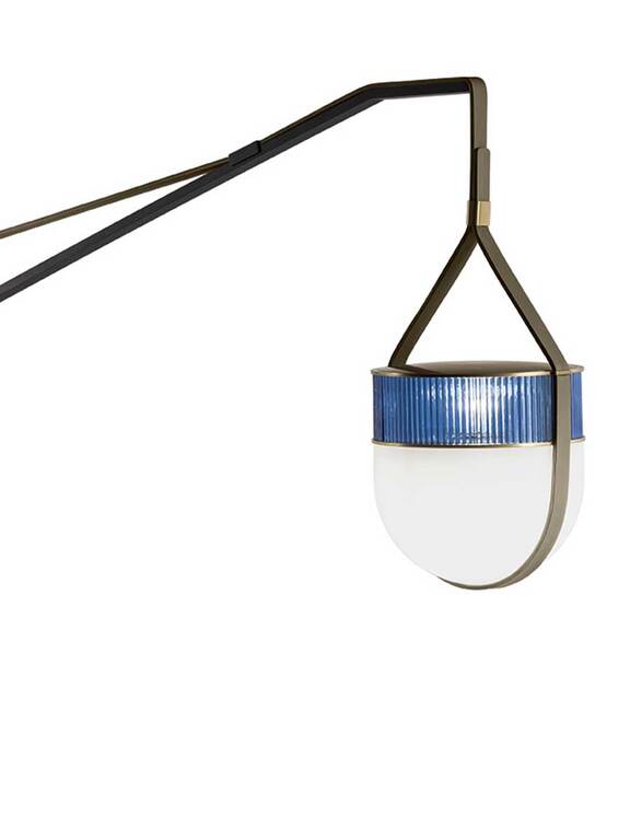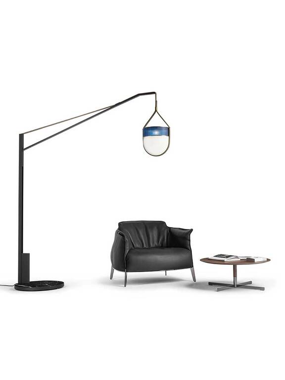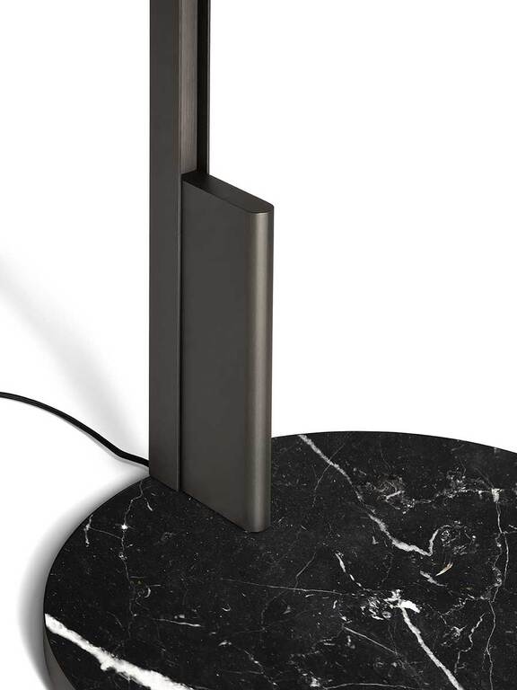アーム式フロアランプバージョンは吊り下がったExtra Largeタイプのランタン1個で形成されています。スタンドのロッドは黒光沢サテン仕上げのスチール製です。グローブが取り付けられているなめし革「Saddle Extra」はベースまで続いており、スチール製の支柱後部をコーティングしています。ベースは半光沢仕上げの「Nero Marquina」大理石製円形ベースとその上に重なったバランスを保つための金属製台座の二重構造になっています。大理石製ベースは板金で縁取りされています。ベースの金属製ディテールは全てバーニッシュドサテン仕上げです。
