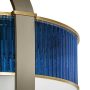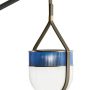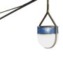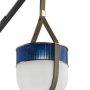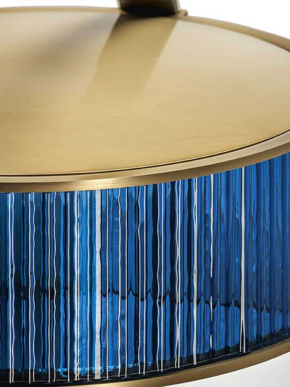 吹きガラスとなめし革で作られたXiランプは、ランタンのように空間で静かに揺れます。グローブは吹きガラス製の2つの要素で形成されています。規則正しいリブ状の表面が独特な上部のガラスは、透明でアンバー、エメラルド、サファイア、ムーンストーンのいずれかの色のグラデーションに着色されています。パール仕上げホワイトの下部のガラスは温かい発散光を演出します。