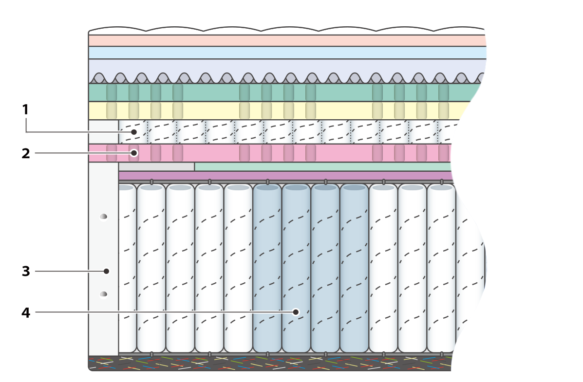コイル高が9インチ(22.86cm)の贅沢なポケットコイルを使用。頭部と脚部のコイルをソフト、腰部をハードにし、より身体のラインにフィットするよう設計しました。